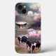 Omisstänkt svart och vit Holsteins betande i fält medan ett rymdskepp ligger i avstånd. En annan typisk ko som kidnappats på den gamla MacDonald-gården. Wombo Dream AI och samarbete med konstnärer.