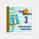 Titta vem som fyller år! Roligt blå uggla på en skogsgård med blå himmel och fluffa moln