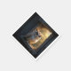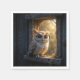 Ett uggla-glas med glasögon är inpassat i ett träfönster ram, omgivet av en glödande, solljus bakgrund