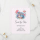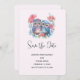 Spara datumkortet med en bild av ett par uggla i kärlek sitta tillsammans på träd gren. Omgiven av blommigtar för söt, grönt och rosa.