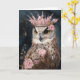 En uggla i krona med tillfällen av rosa blommor med blanketter i hälsningskortet