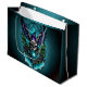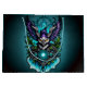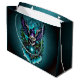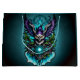 Uggla med magiskt inslag. Utformningen har ett imponerande, stiliserat uggla med vingar uppslaget, designat i en pulserande färg palett av lila, blått och vitt. Uggla har en stor närvaro, medan dess piercing gult ögon tittar direkt på tittaren och skapar en känsla av intensitet och mysterium. Intrikera, rotera mönster uppåt runt uggla, påminner om magiska symboler, ge hela bilden som en mystisk aura.