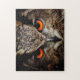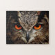 Uggla. Färg närmar sig färg fotografibilden av ett uggla huvud och ansikte som visar skaka, orange färgad öga och fjädrar.