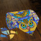 Ett mosaiskt uggla skapar ett djärvt intryck i denna roligt och en sjudande formgivning. och blå omger fågelns stora runda ögon.