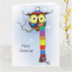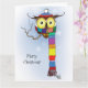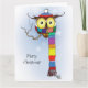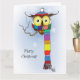 Bara lite och mycket runt uggla sitta på en gren som bär sin sjal och hatt med flera färgader. Snöflingor faller över hela uggla.
