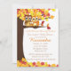 Titta vem som får Tvillingar! Fira tvillingarnas ankomst med denna baby shower-inbjudan. Den har en färgrik bakgrund med ett träd som har ljusa höstblad i rött, gult och orange. Det finns en familj ugglor: Pappa, Mamma och 2 bebisar som sitter på en gren i trädet. De har höstfärgade randiga halsdukar runt halsen. Anpassa genom att lägga till din festinformation i mitten. Ta en titt på de många andra produkterna och designen i denna kollektion.
