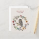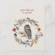 Whimsisk design med en uggla inuti en blomster- och grönskrans.