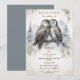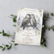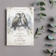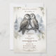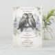 Anpassa denna eleganta bröllopsinbjudan med lagrugla. Inbjudan har en vacker illustration av två lagruglor. Ugglorna är omgivna av mjuka, vita fjädrar och bakgrunden är tallar och berg. Inbjudningarna är tryckta på högkvalitativt kartongpapper och finns i olika storlekar.