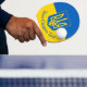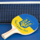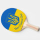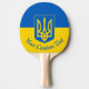 Ping pong paddle with the flag of Ukraine, a blue and yellow flag with the Ukrainian coat of arms (emblem) with a trident in the center, and a custom text template for your message