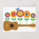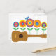 En vågrät avbildar av en brun ukulele, med stylized blommor och en blåttfågel som fjädrar upp från ukulelen.