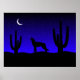Omfamna vildmarkens anda med denna stämningsfulla sydvästliga design. Med en ensam varg silhuetterad mot en djupblå stjärnhimmel fångar denna scen en fridfull öken natt, inramad av saguarokaktusar och en lysande halvmåne. Dess djärva, grafiska stil och lugna färgpalett gör den till ett mångsidigt val för heminredning, kläder eller brevpapper för naturälskare och fans av den amerikanska västern.