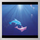 Ett dynamiskt digitalt foto av två delfiner som har roligt i havet med geléfisk i bakgrunden. Ett färglöst foto för vilket barnrum som helst, delfin älskare och alla andra som tycker om vad de ser:)