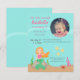 Gullig och färgglad sjöjungfrufödelsedagsfest inbjudan som har lite en sjöjungfrutecknadflicka med orange hårsitta på en sten. Hon skapar en vänskapsmatch vinkar till fiskarna och krabban, som är närliggande, och till partygästerna som är inbjudna till partyet. Flickaktigt en inbjudanför barn och underbar för sjöjungfru eller under havet, undervattens-, hav och themed födelsedagsfester för bassäng. Personifiera lätt med ditt information och foto av födelsedagflickan.