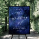 Det här välkomsttecknet i bröllop har en mörk blått bakgrund i himmel, en elegant och ett kalligrafiskript som säger "Bröllop i". Den här utformningen skulle vara perfekt för alla som planerar en bröllop i natt, eller för alla som är intresserade av astronomi och rymd.