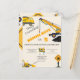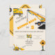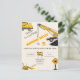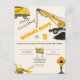 Under Uppbyggnad Födelsedagsfest Inbjudan med lastbilar, kran och traktor. Söt byggtemafest inbjudan. Gul, orange, vit, svart och grå färgpalett.