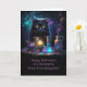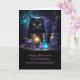 Fantasy Happy halloween med en mystiskt söt svart katt och magiska potioner. Underbar dotterdotter roligt hälsning för helgdag.