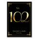 Underbara Gatsby Art Deco bröllop-kort för bordsnummer med gyllene nummer 102 och utbytbar text, där du kan lägga till datum för namn och bröllop, tryckt på svart bakgrund