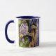 Hoos Look'n, kaffemugg, en underbar grå uggla i ett gammalt träd i Yellowstone parkerar, en original- vattenfärg från konst vid JoLyn.
