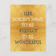 "Livet behöver inte vara perfekt för att vara underbart" vykort med svart och vit typografi på guld. Sprid ord av uppmuntran långt och brett.