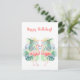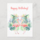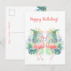 Grattis på födelsedagen! Romantisk vykort med "Underbar saga för två flamingor" akvarellillustration, kalligrafitext - "Fred, glädje, kärlek", Vackra två rosa flamingor, tropiska exotiska blommor, lövverk, djungel blomsterutsmyckning, trädgård, sommar, resa, semester, födelsedag, semester (gåvor till henne). Inbjudningar & brevpapper > Vykort. Textmall. Anpassa dem genom att lägga till namn. Tvåsidig grafisk dekoration.