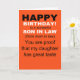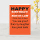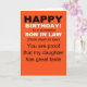 Son i juridik bevisar dotterns bra smak, säger framsidan av detta roliga födelsedagskort. Kortet utfärdades med en svärmor i åtanke som önskemål teaserar sin dotters make när han firar att han blir äldre med ett år. Det söta budskapet på insidan förkroppsligar den söta komplimangen på framsidan i en smygande, men chockerande humoristisk jacktation som kommer att få dotterns make att skratta högt.