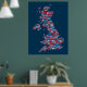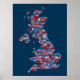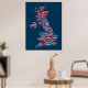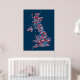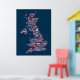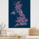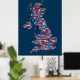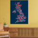 En typografisk text karta i Underbara Storbritannien som visar över 400 städer och städer i Förenade kungariket, röd, vit och blå text i blå bakgrund.