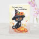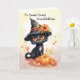 Skicka dina underbara barnbarn en Halloween-överraskning! Det här fina kortet har en söt svart katt, med snygg ögon och en hatt, omgiven av pumpor och en orange daisy. Perfekt kort för att önska dem en förhäxningstid!