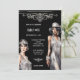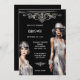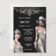Två vackra kvinnor bär sömnlösa faux silver Flapper-flickans fringerade klänningar och pärlor. Den kaukasiska kvinnan har en elegant silver hatt med ribbon på huvudet och melaninkvinnan en chic huvudband med dekorativ blommigt. Båda kvinnorna har sliek, kort bobs och står mot en svart bakgrund som innehåller mallar för din anpassningsbar. Två faux silver ornate art deco stil ramar fullbordar denna lyxiga utformning som passar för en uppåtgående tvillingtid, 1920-talet, underbara grindby, vintage art deco themed event eller firande. De är perfekter för både affärsverksamhet och personlig använda. Baksidan är ren svart