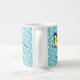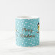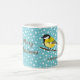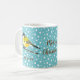 Anpassningsbart jultema mugg med Desteis ursprungliga tecknad illustration av en söt Underbar fläck/Parus Major-fågel. Fågeln har gult och svart färg på den. Bakgrunden till färg är blå med mönster av vit snö. I mitten står det "God jul" i bruna färg och det finns också ett anpassat textområde för ett eget namn under fåglarna.