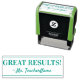Den här positiva utformningen av gummi frimärke innehåller det positiva återkopplingsmeddelandet "UNDERBARA RESULTS!" och en personlig lärare namn. Det skulle kunna användas av en lärare, lärare eller en lärare när de markerar uppdrag för att visa att student har utfört ett underbart arbete.