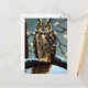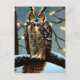 Vackra AI skapade ett vykort för Underbar hornsklubb uggla som var på ett gren täckt av snö med vitt ljus i träd och en stjärnbakgrund i himlar.