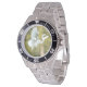En Underbar vit gret som står i en ytlig flod och stalkar en fisk. Fågelns reflektion ses i den stillastående lugnen vatten.