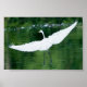 En vacker Underbar vit gret under flygning över en flod med vingar sträckt ut.
