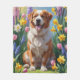 En glad hund sitter fredligt på lush grönt gräs, omgiven av färgfulla vår blommar under ett mjukt blå himmel. Den här digitala oljemålningen fångar upp ett ögonblick med uttryckliga penseldrag, varmt färg och en känsla av varm glädje.