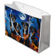 Släpp upp spookandan med den här eerie Halloween-designen med en hundar-förpackning under en mörk, månbelyst himmel, omgiven av flygande fladdermus och glödande pumpor. Perfekt för dem som kärlek en aning skrämmande roligt med sina hårigets vänner!
