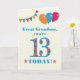 Ett färgstarkt födelsedagskort för en 13-årig underbar barnson. Det stora antalet 13 är fyllt med en orange, röd och blå mönster, som är skriven i ljusblå blått. Det finns ballonger och buntar överst, i matchande färg och framkåpan hälsning är "Underbar sonson, du är 13 i dag!" i ljusröd och blå skrift, på mycket blek gult och vit polkamera, med röda stjärnor och orangar på varje sida av orden "TODAY!". Om du vill kan du enkelt anpassa eller ta bort det inre meddelandet.