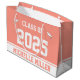 I denna peachy rosa and white presentbag står "Class of 2025" i stor vit text. (Du kan ändra året om du behöver.) Vid grund finns det en peachy rosa text som du kan ändra för att visa rätt namn för student. White student är på vardera sidan om frasen "Class of".