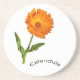 Orange blomma med etiketten namn "Calendula" Fotografisk närhet med trädroppar som visas på petaler.