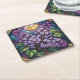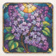 Detta underlägg visningar en bild av nedfläckad glas stil av blomningslaktor på blå bakgrund. Lekarna finns i lila, rosa och blått. Grönt lilac löv är bland blommorna. Bilden ramas av ett dekorativt gräns med geometriskt mönster i guld, lila och turkos. Överst på konstruktionen finns en solnedgång mönster i gult, guld och vitt, som skapar en radiell effekt. Bakgrunden har geometriska former för abstrakt i blues, lila, guld och turkos. Underlägg är en fyrkantig papper massa som underlägg. Underlägg innehåller sex pappra underlägg.