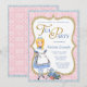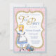 Underlandet teparty inbjudan med söt Alice och tekopp på en snygg rosa damask och blå bakgrund. Denna vackra rosa, blå och gyllene Underlandet teparty inbjudan kan enkelt anpassas för ditt evenemang genom att helt enkelt lägga till dina uppgifter i den teckensnittsstil och färg du väljer. Detta är en tryckt design utan verklig glitter.