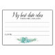 De här charmerande idékorten för bäst datum kommer att vara perfektens tillägg till en möhippa eller på bröllopsmottagningen. Den här designen har en kombination av handskrift och blockering av typsnitt i svart och markeras med en kulent bukett. Det finns utrymme för gäster att lämna sin favoritnattidé om datum och namn på framsidan och på namn och bröllop på baksidan.