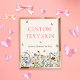 Det här är ett sött och bohemiskt tecken på bord för en babydusch. Anpassa enkelt texten för tecknet för allt du behöver, t.ex. en papperskorg, nappar-jakt osv. Konstruktionen har söta och vismska fjärilar och bin ovanför en fält av vackra, omgivande, känsliga blommigtar av vilda blommor i söt blå, terrakotta, rosa, rost, lila och gult. Kontakta designern om du vill ha några ändringar av denna design eller om du vill ha ytterligare matchande produkter.