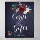 Kort och gåvor bröllop-tecken med vattenfärgad blommigt bouquet i trendig vinterröd burgundi och vit peony ro med gräs säsong fir grenar, rödbär och löv över en grönt vid midnatt, marin blå krita. +++++++++++++-Perfekt för en elegant rustik vintertid säsong/jul blommigt bröllop.