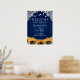Romantisk marin blått välkomsttecken från bröllop som innehåller solblommor och baby utandningsblommor mot bakgrund av rustiskt trä, försedd med vit blommigt snöre och sträng ljus. Matchande objekt är tillgängliga.