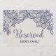 Detta "reserverade" skylt för snöre och marinen bröllop är perfekt för ett tema för land chic bröllop. Utformningen är dubbla sidig (båda sidor skriver ut) och har vackra blå blommor i snöre på en gräddvit bakgrund som täcker lårbenet och ett modernt kalligrafteckensnitt i feminin. Använda korten till att reservera stolar eller bord vid ceremonin eller mottagningen i bröllop.