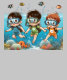 En glad illustration av tre barn som normaliserar under vatten och utforskar en pulserande korallrev fylld med färggrann fisk, korall och en vänlig bläckfisk. Barnen bäror gogglar, snorkar och matchar baddräkter i blått, grönt och orange, och fångade upp kändisen och vänskapen under havet.