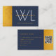 En modern monogramdesign med marinblå bakgrund i färg och guld. Ett minimalistiskt affärskort av QR-personligen för både manar och kvinnor som har en flagga för stil. Ett enkelt och professionell sätt att presentera ditt företag. Anpassa dina uppgifter för att skapa ditt eget unika affärskort.