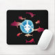 Grafisk design som representerar en person i yoga lotus-position (även kallad padmasana) inuti en bubbla omgiven av hajar. Behålla er stilla attityd oavsett omständigheterna! Mus Pad för meditation älskare.