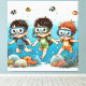 A cheerful illustration of three kids snorkeling underwater, exploring a vibrant coral reef filled with colorful fish, coral, and a friendly octopus. The children wear goggles, snorkels, and matching swimsuits in blue, green, and orange, capturing the excitement of discovery and friendship beneath the sea.