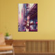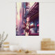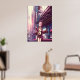 En ung flicka med rosa hår som går på gatan i staden med många höga skyscraper och andra byggnader. Det här är en AI-skapad konst.